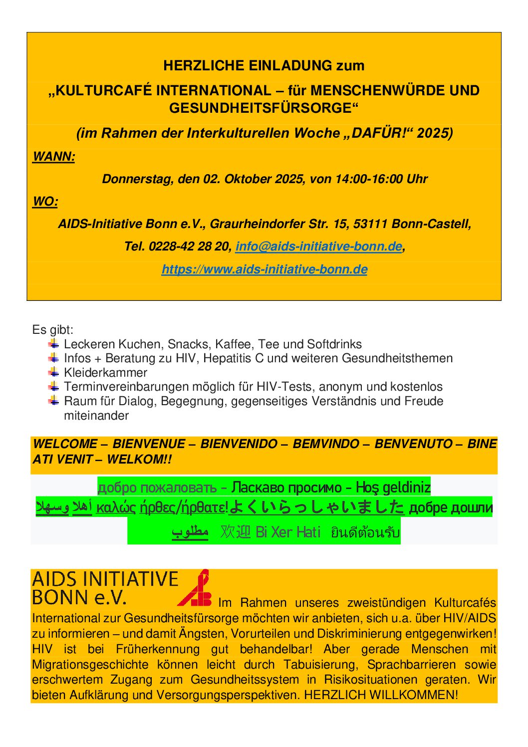 1. März 2011 Die AIDS-Initiative Bonn lädt zum Frühjahrsempfang am 11. April um 17 Uhr ein. Anschließend ist bei einem Imbiss und Getränken Gelegenheit zu Austausch und Gesprächen.