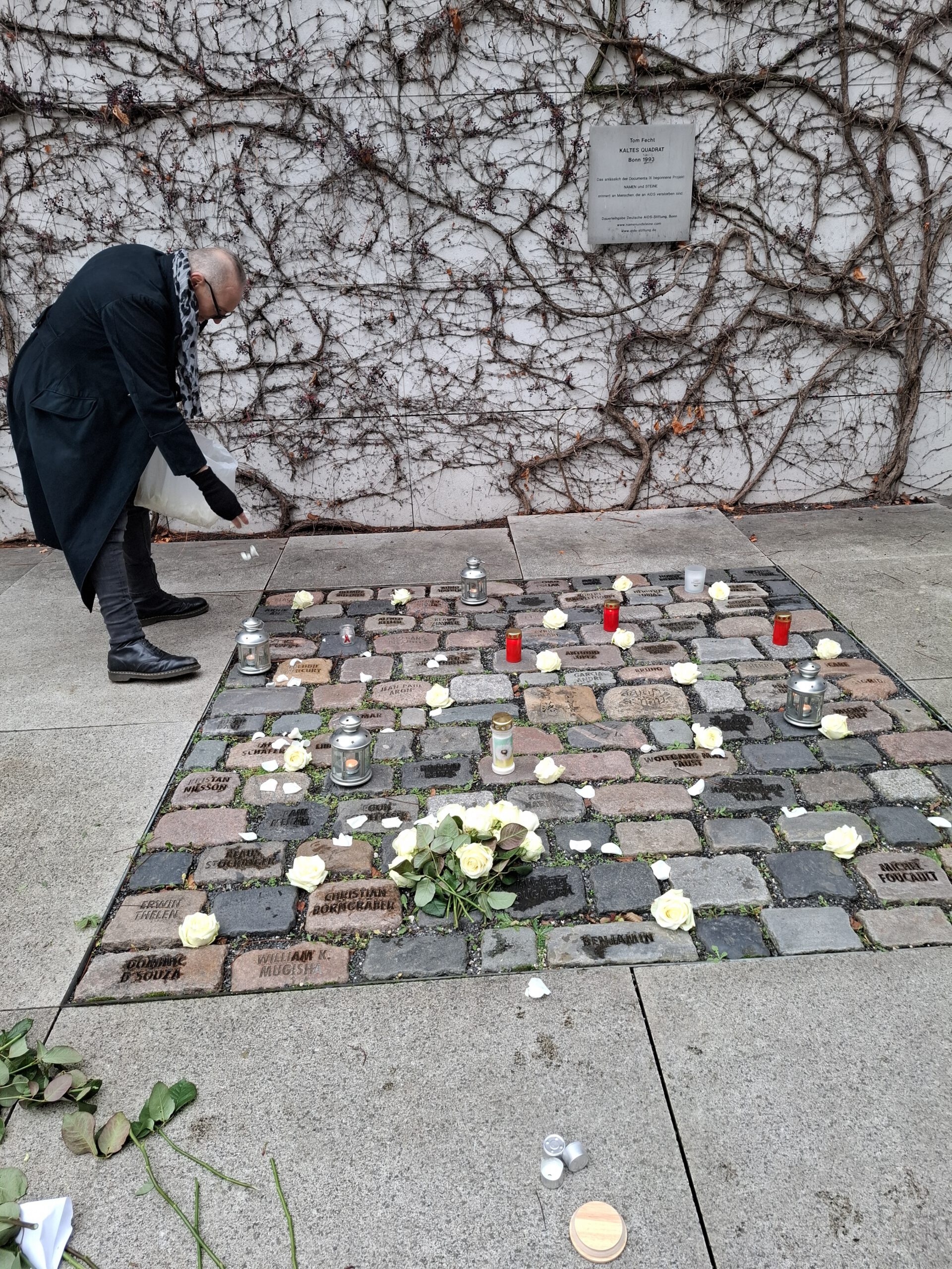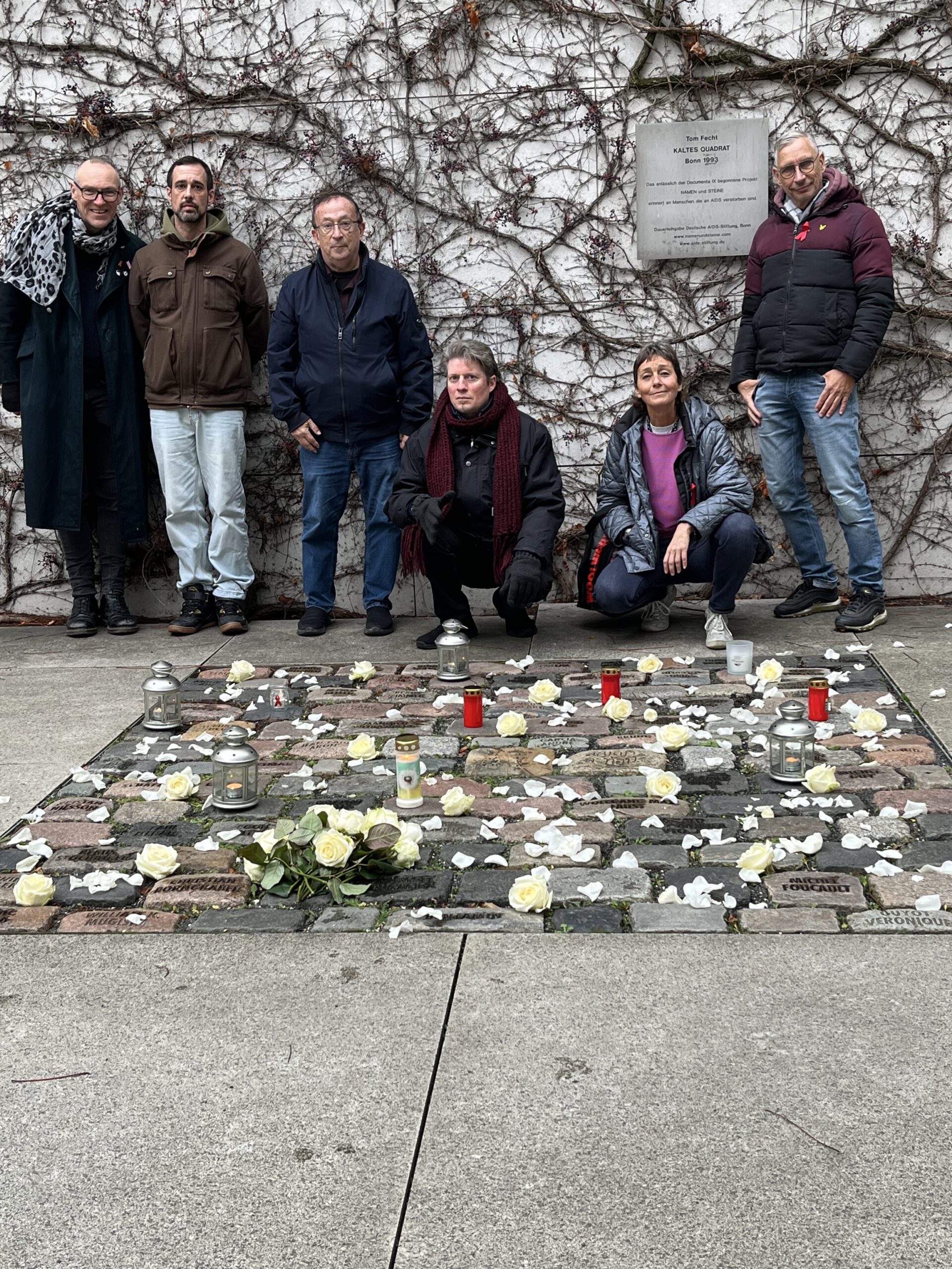 - „Zur Erinnerung – Aktion Namen und Steine“ vor der Bundeskunsthalle am 03. Dezember bei der DAS-Memorial-Installation „Kaltes Quadrat“ vom Künstler Tom Fecht (dort legten wir Blumen und Kerzen nieder).